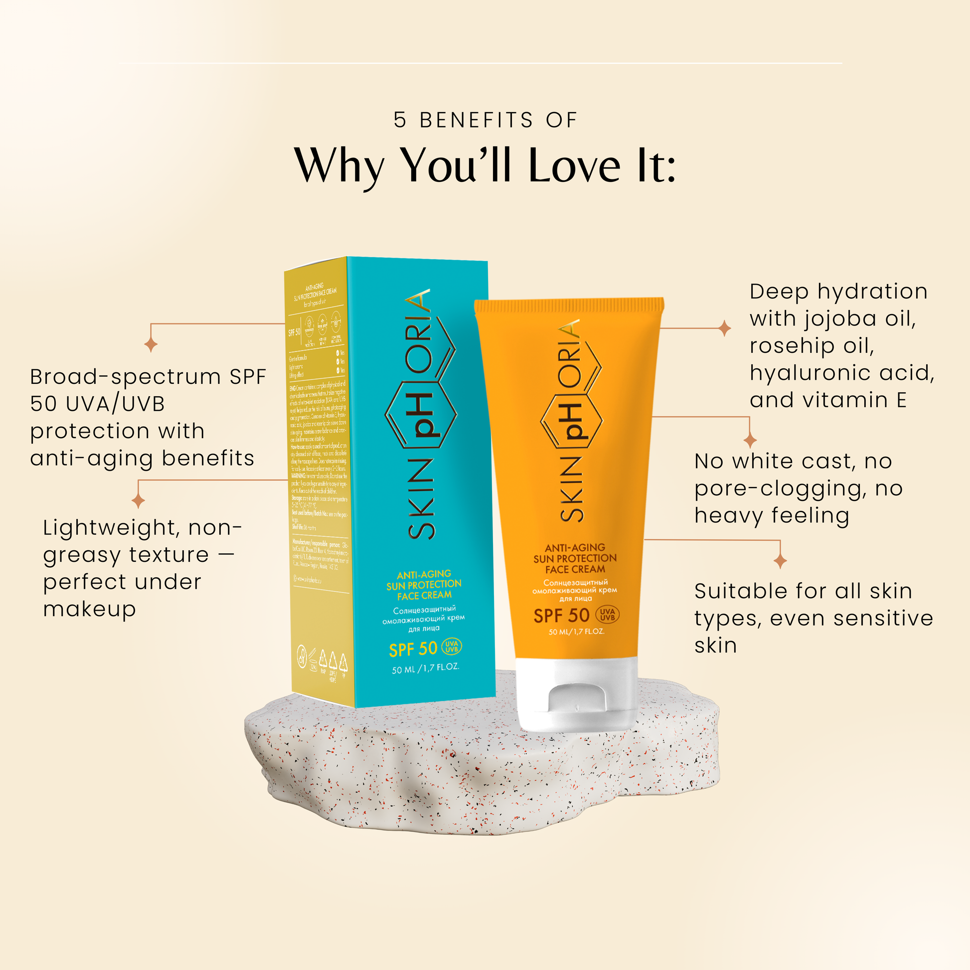 - Broad-spectrum SPF 50 UVA/UVB protection with anti-aging benefits